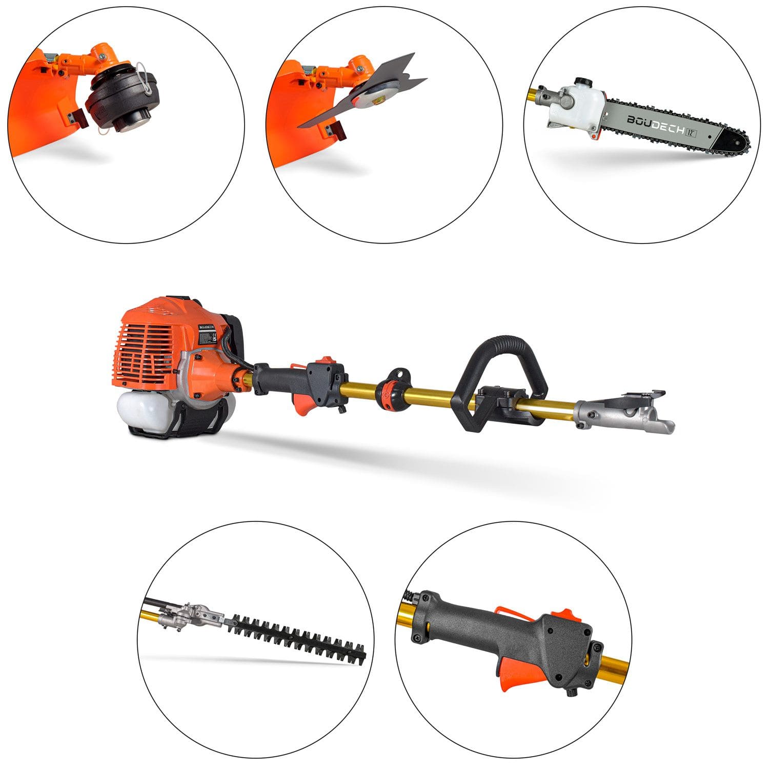 Il decespugliatore multifunzione 8-in-1 con motore da 52cc unisce potenza e versatilità in un corpo resistente in lega anodizzata. Perfetto per tagliare, potare e rifinire con facilità.